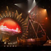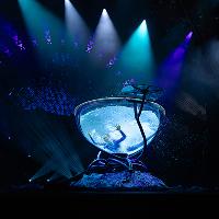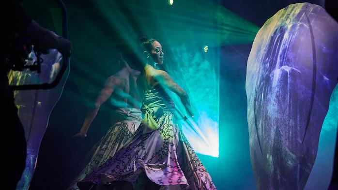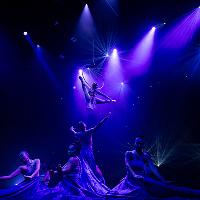 On Stage: The theatre transforms as the Aerial Lyra artist rises against a sparkling sky. Below, dancers ripple like the tides, uniting ocean and moonlight.